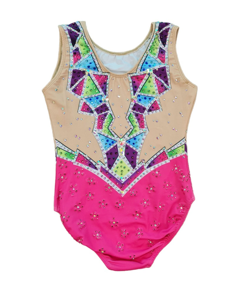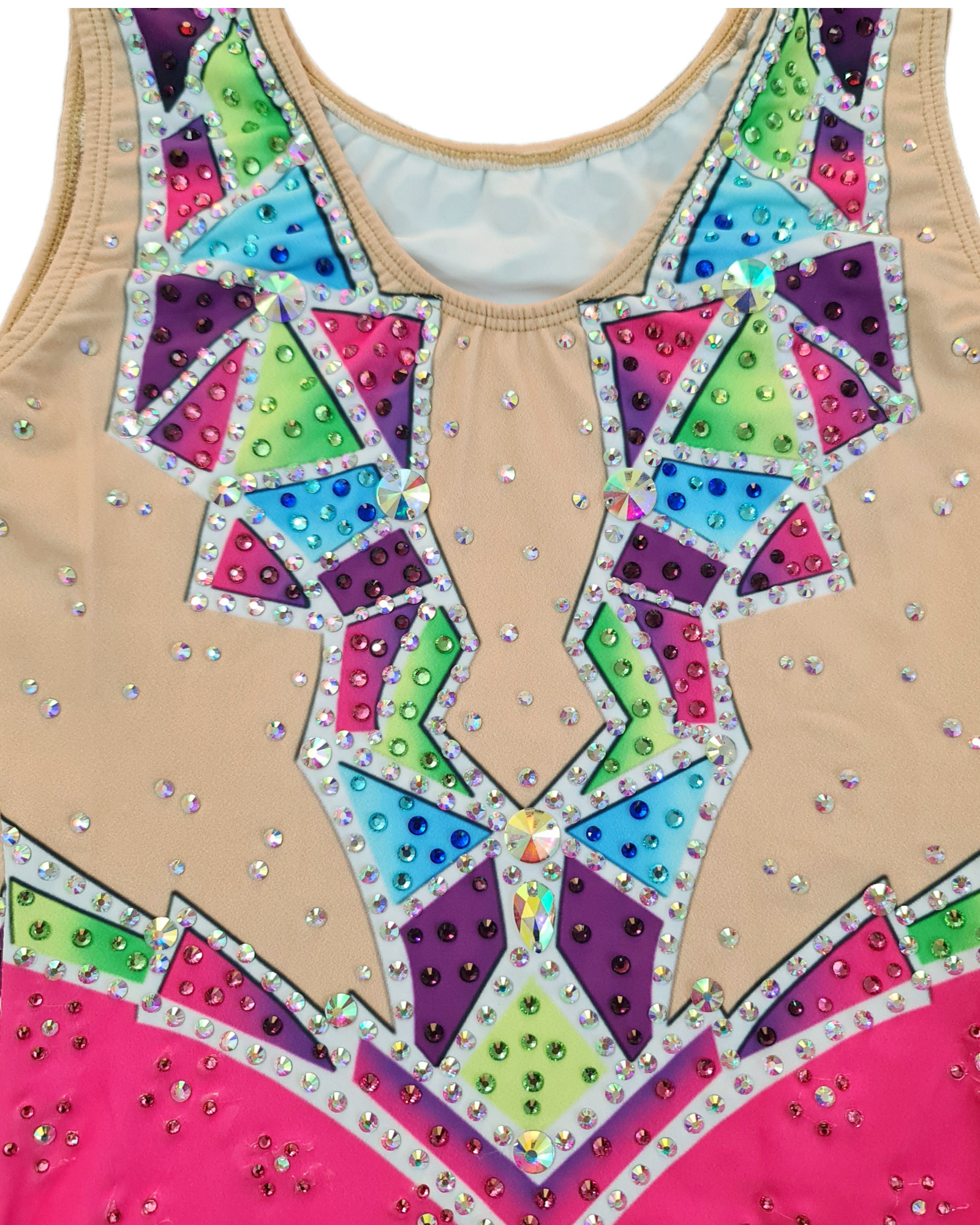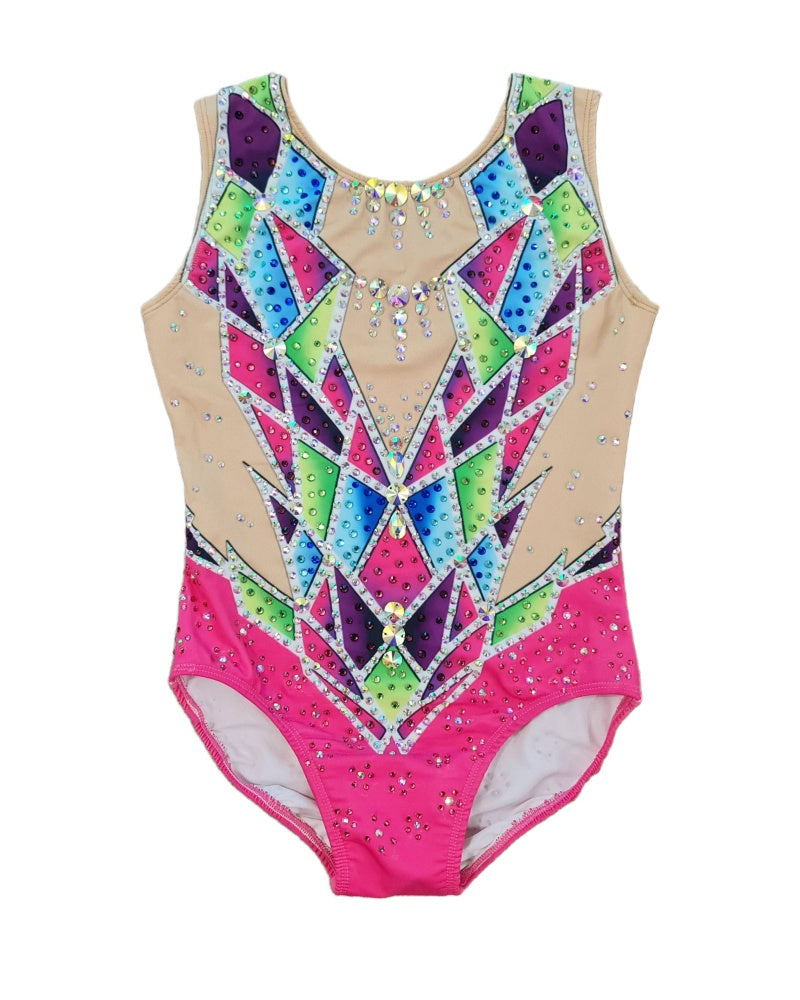 Prism Radiance—symbolizing the way light refracts through a crystal to create dazzling colors. This sharp, dynamic design and gemstone-like colors leotard features a bold, geometric pattern with vibrant shades of pink, blue, green, and purple, accented by rhinestones for a sparkling effect.