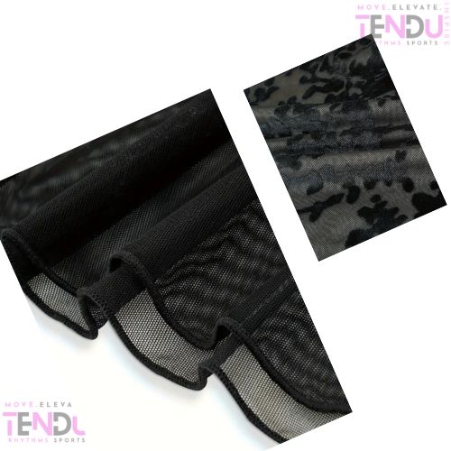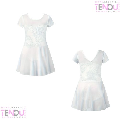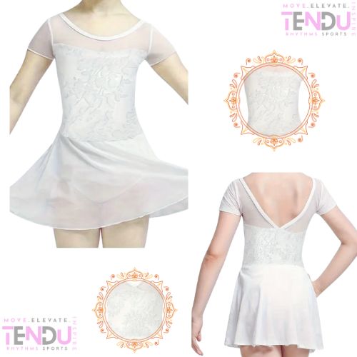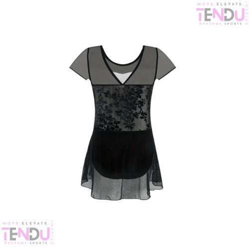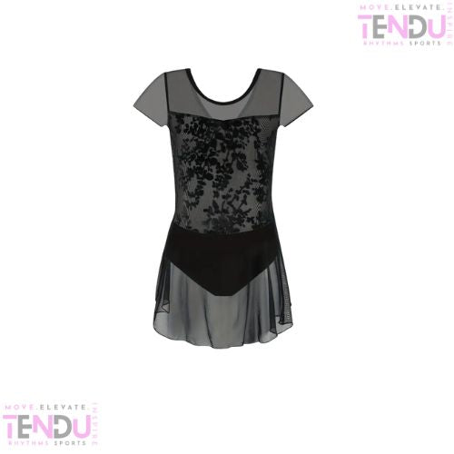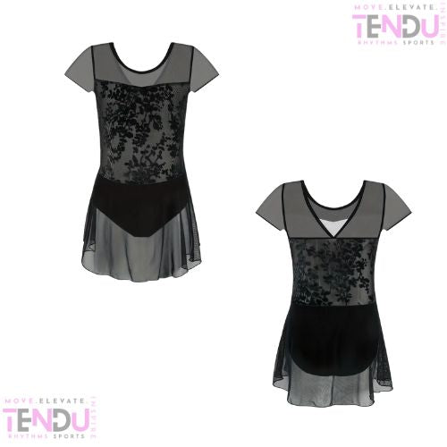 Details:  Short sleeve leotard with elegant deep V back design, Single-Layer flowy skirt hem, Flocking printing fabric design,  Contrast Mesh,  Medium-Stretched Leotard.